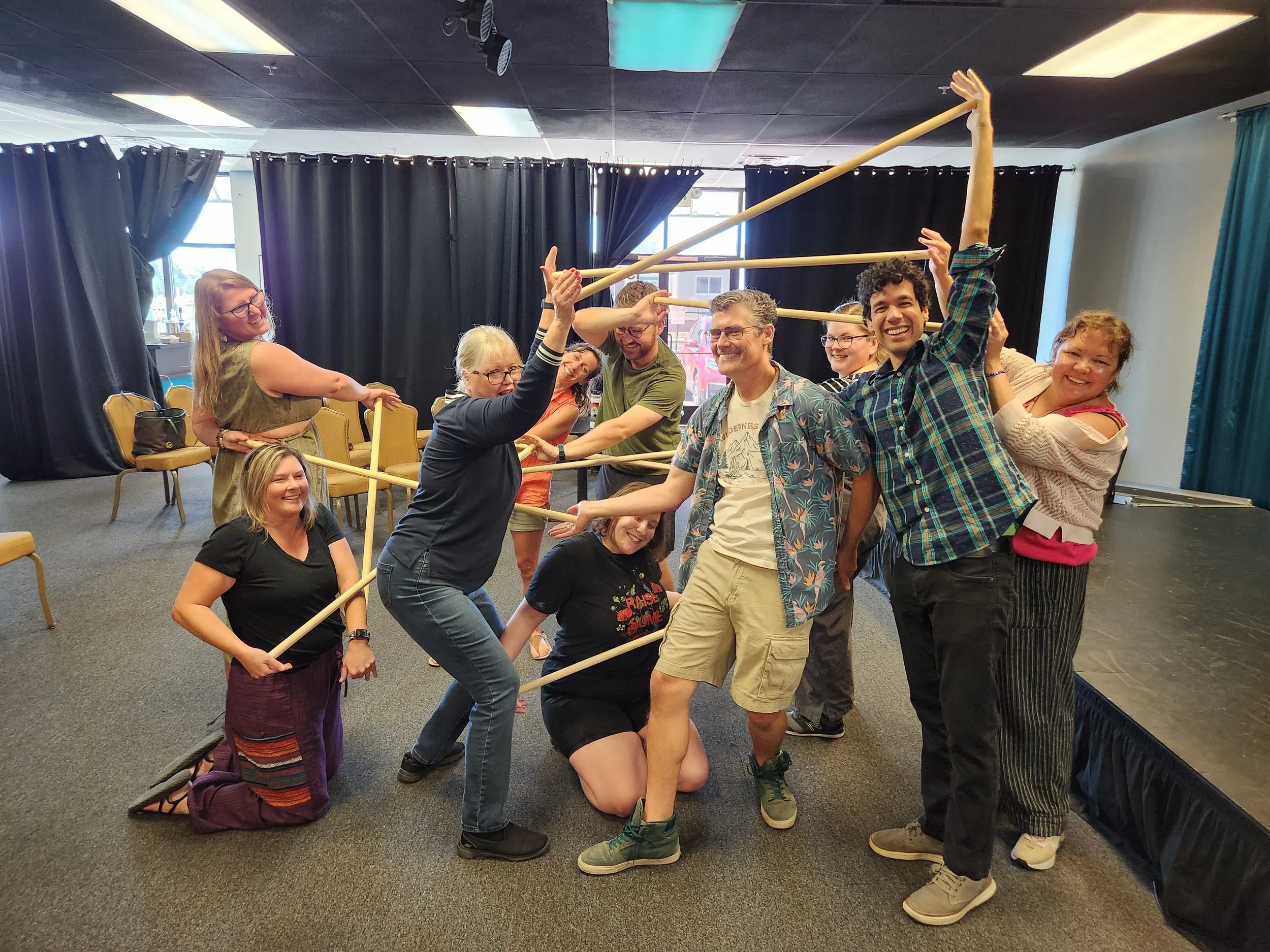 At Peak Improv Theater, we use sticks as a tangible representation of connection, solidifying the abstract concept of partnership, which fosters physical awareness, builds trust, and promotes non-verbal communication.