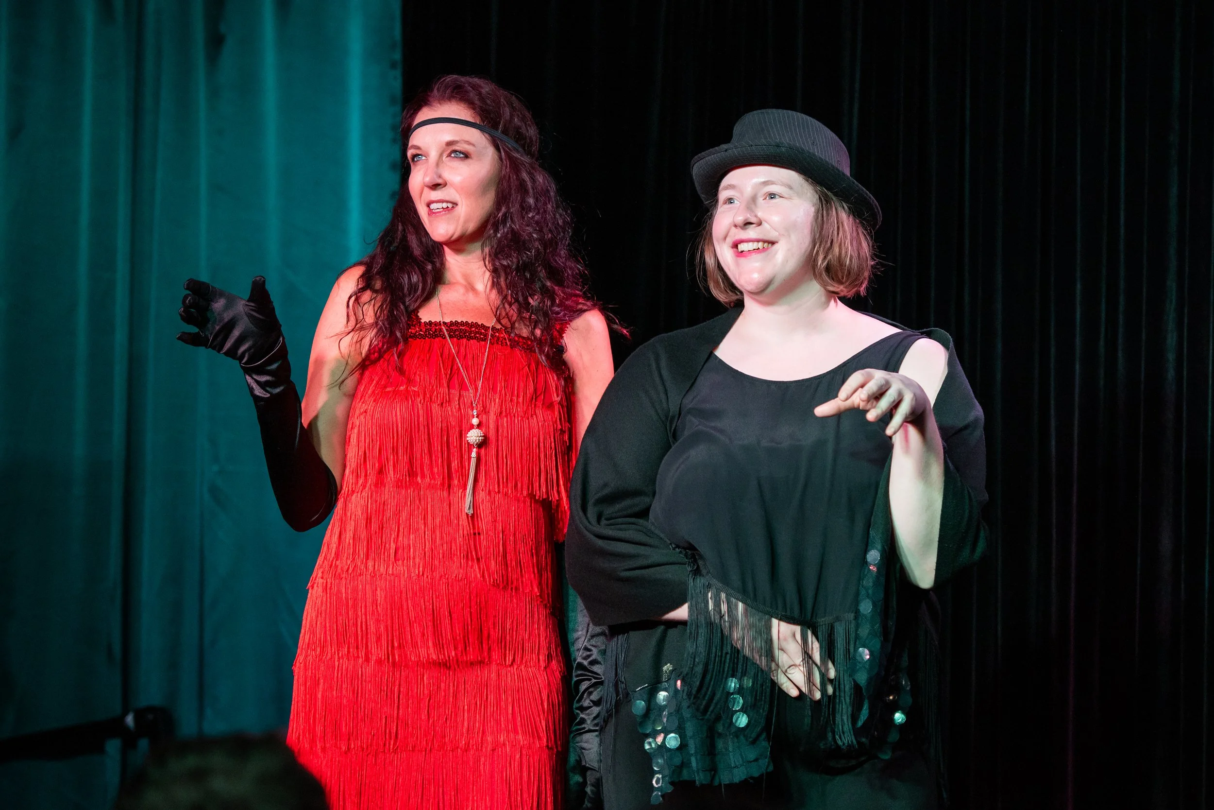 Meggan and Steph comically serenade the audience during a Tune Titans show.